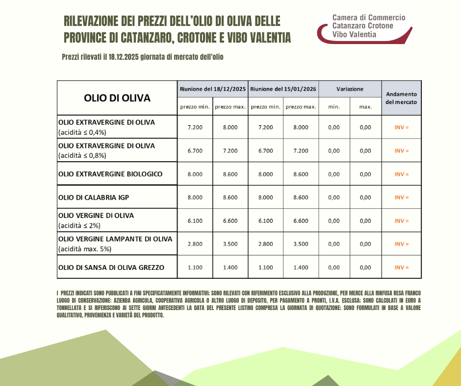 RILEVAZIONE DEI PREZZI DELL’OLIO DI OLIVA DELLE PROVINCE DI CATANZARO, CROTONE E VIBO VALENTIA 15 GENNAIO 2026