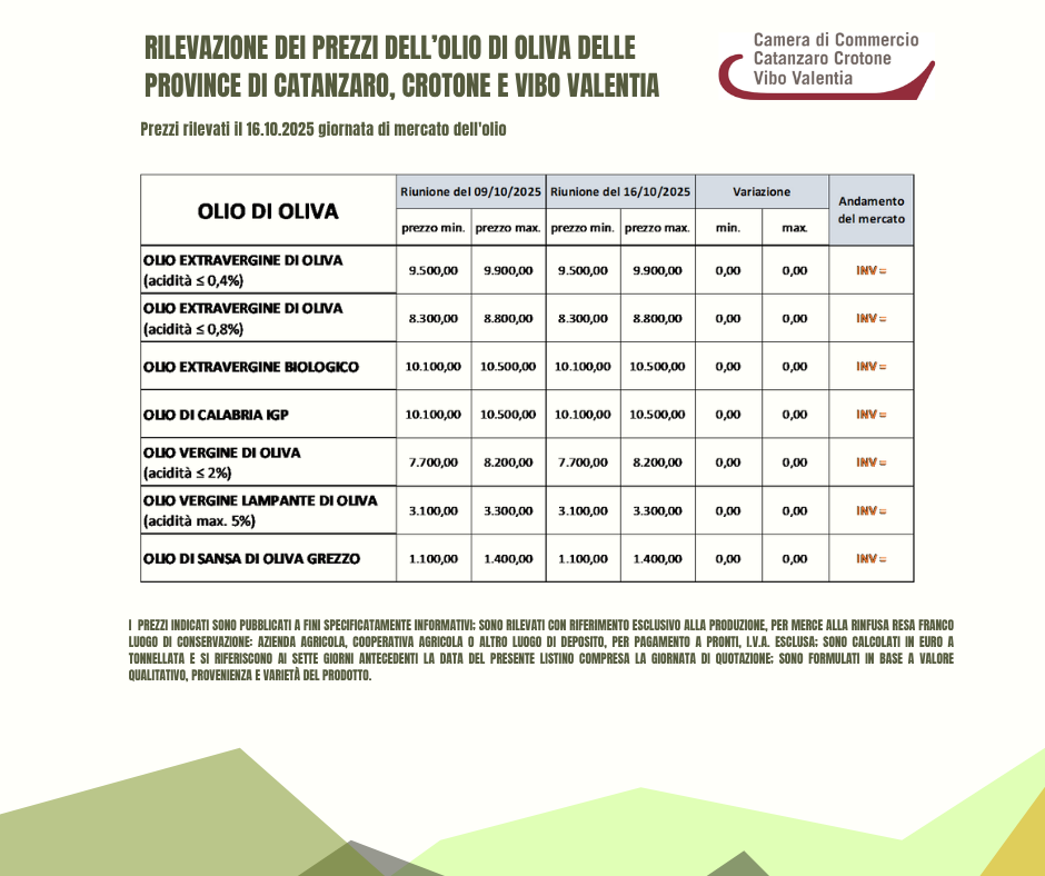 RILEVAZIONE DEI PREZZI DELL’OLIO DI OLIVA DELLE PROVINCE DI CATANZARO, CROTONE E VIBO VALENTIA 16 OTTOBRE 2025
