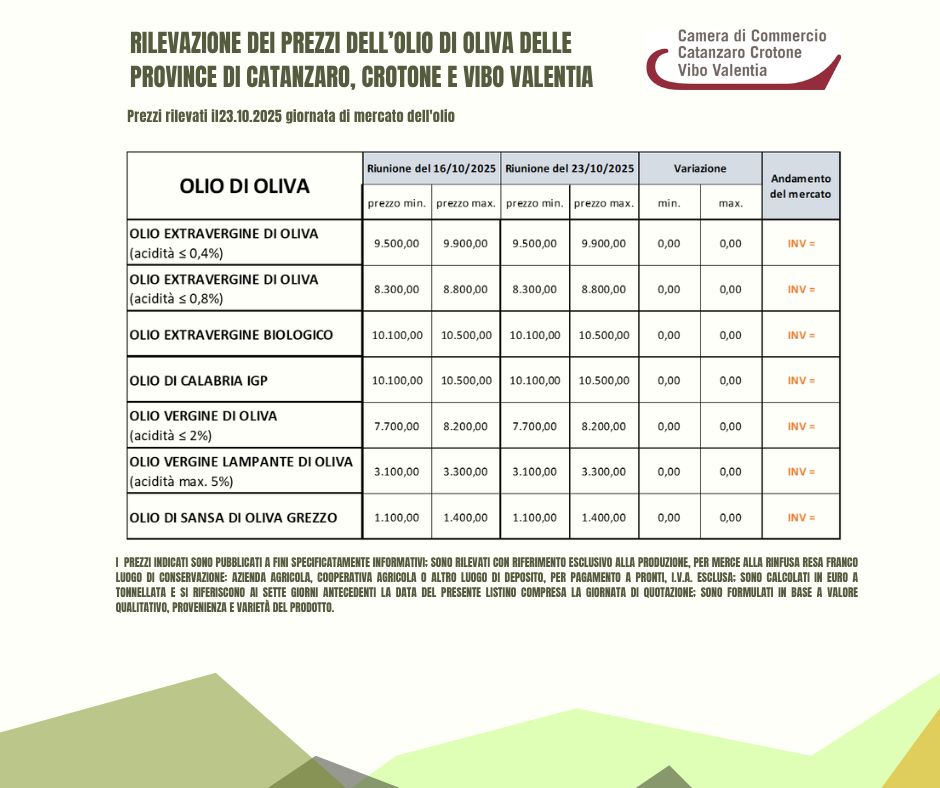 RILEVAZIONE DEI PREZZI DELL’OLIO DI OLIVA DELLE PROVINCE DI CATANZARO, CROTONE E VIBO VALENTIA 23 OTTOBRE 2025