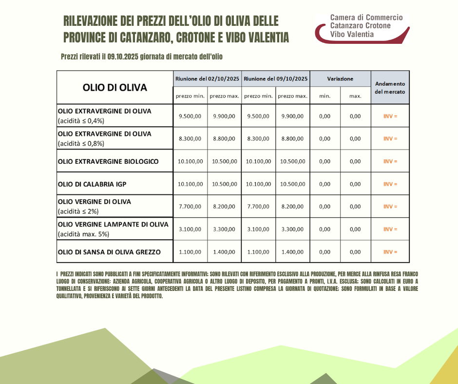 RILEVAZIONE DEI PREZZI DELL’OLIO DI OLIVA DELLE PROVINCE DI CATANZARO, CROTONE E VIBO VALENTIA 9 OTTOBRE 2025