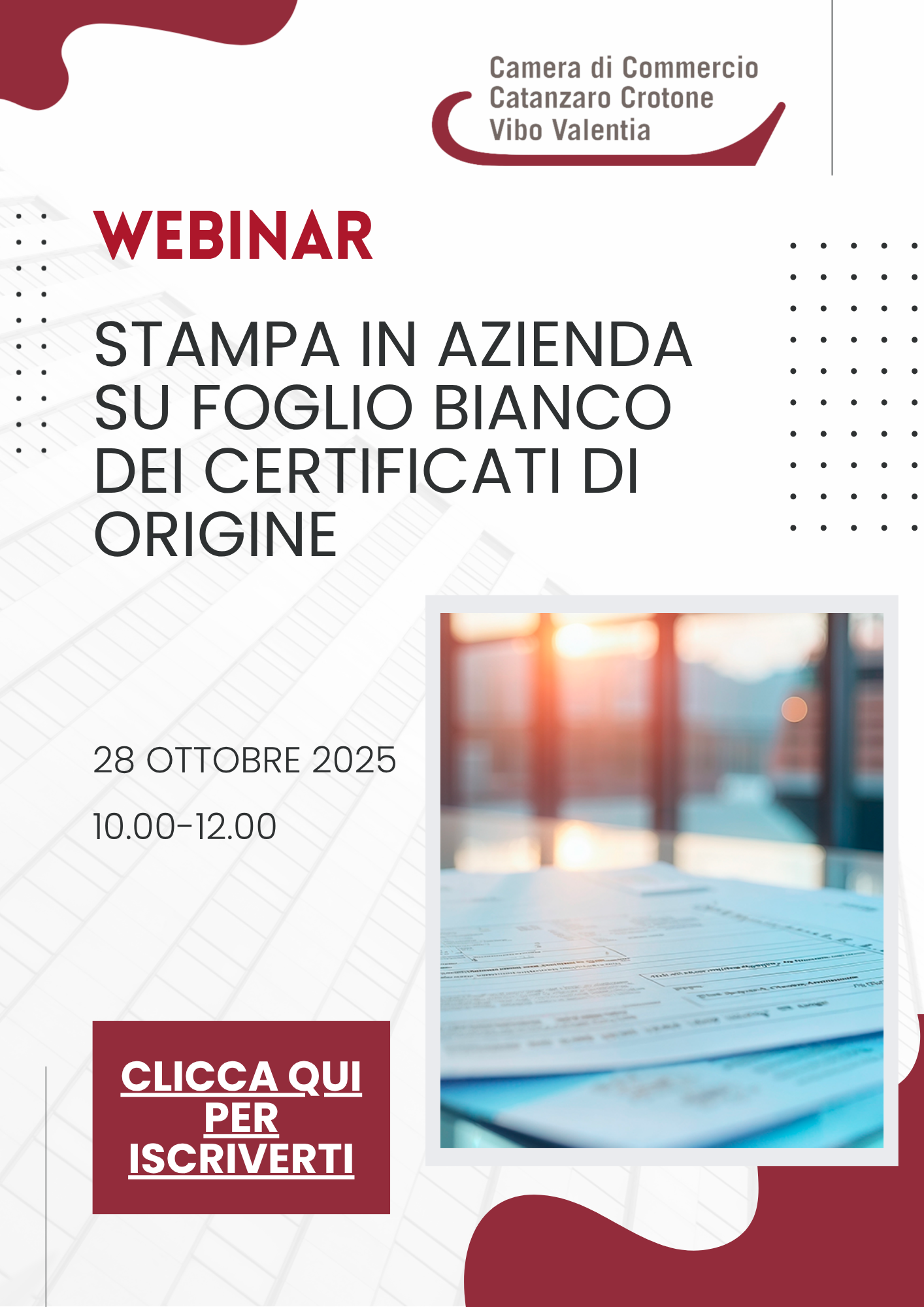 La Camera di Commercio organizza un webinar informativo dedicato alla presentazione della nuova modalità di rilascio dei certificati di origine. L’iniziativa ha l’obiettivo di fornire un quadro chiaro e aggiornato delle procedure, offrendo un’opportunità di approfondimento per tutte le imprese che operano nel settore dell’export.